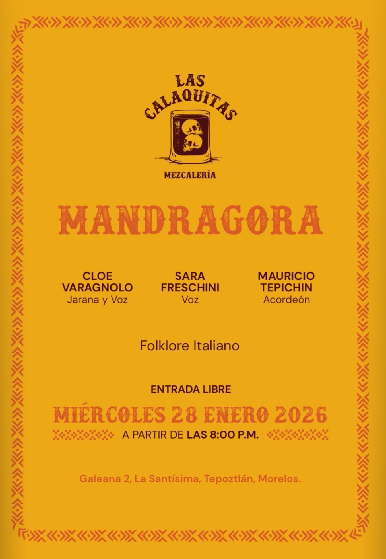 Las Calaquitas Tepoztlán Galeana #2, La Santísima, TepoztlánCloe Varagnolo, Sara Freschini y Mauricio Tepichin se presentan en Las Calaquitas