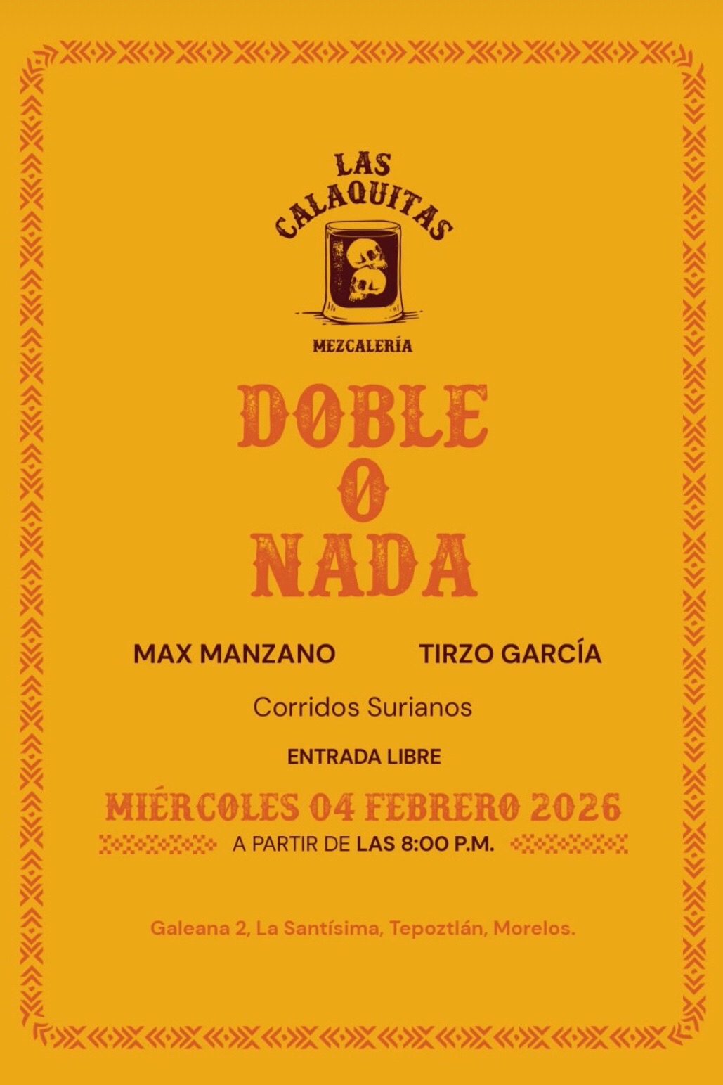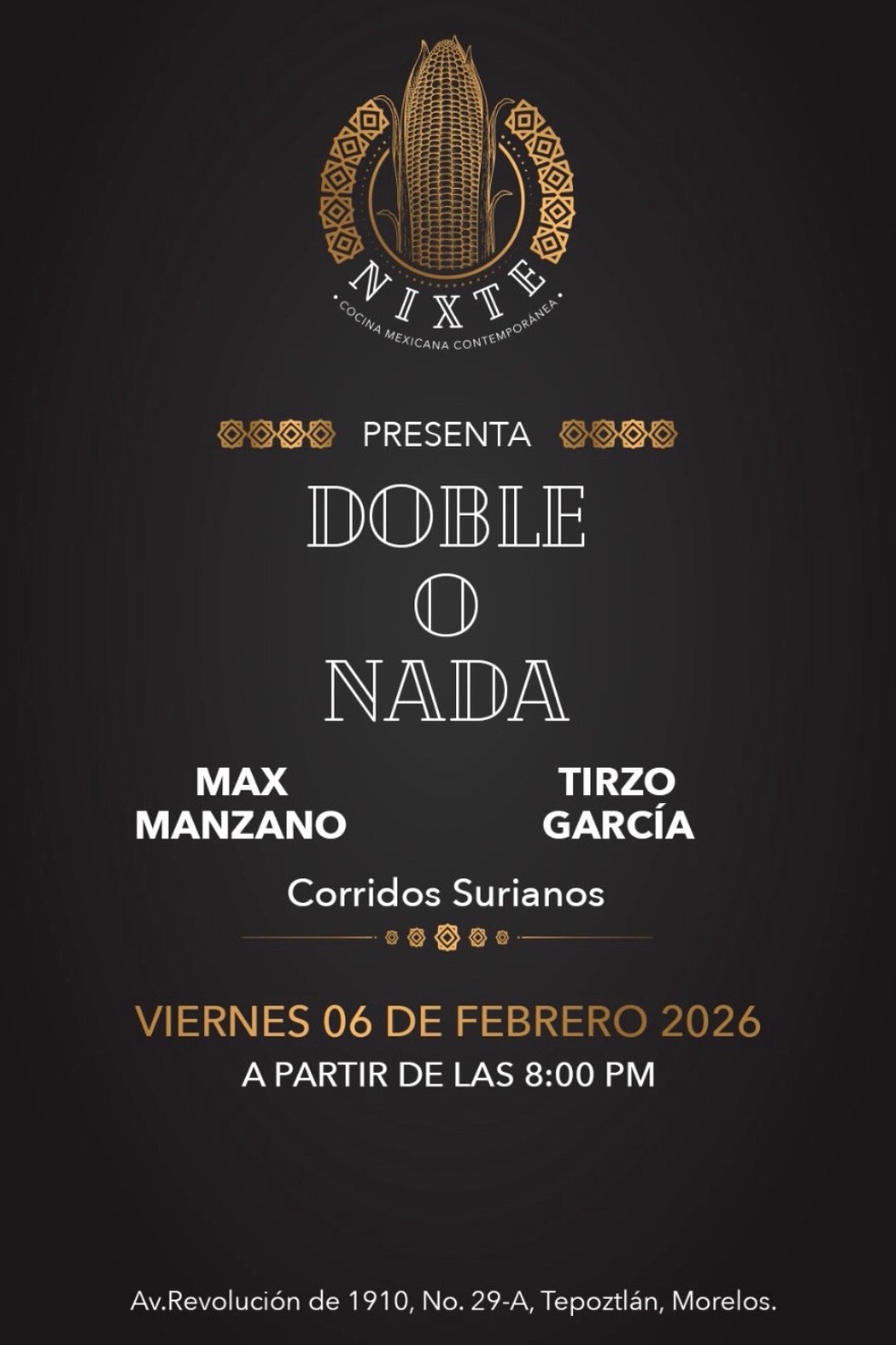 Nixté Tepoztlán Av. Revolución de 1910 #29-A, centro, TepoztlánCorridos surianos con Max Manzano y Tirzo García